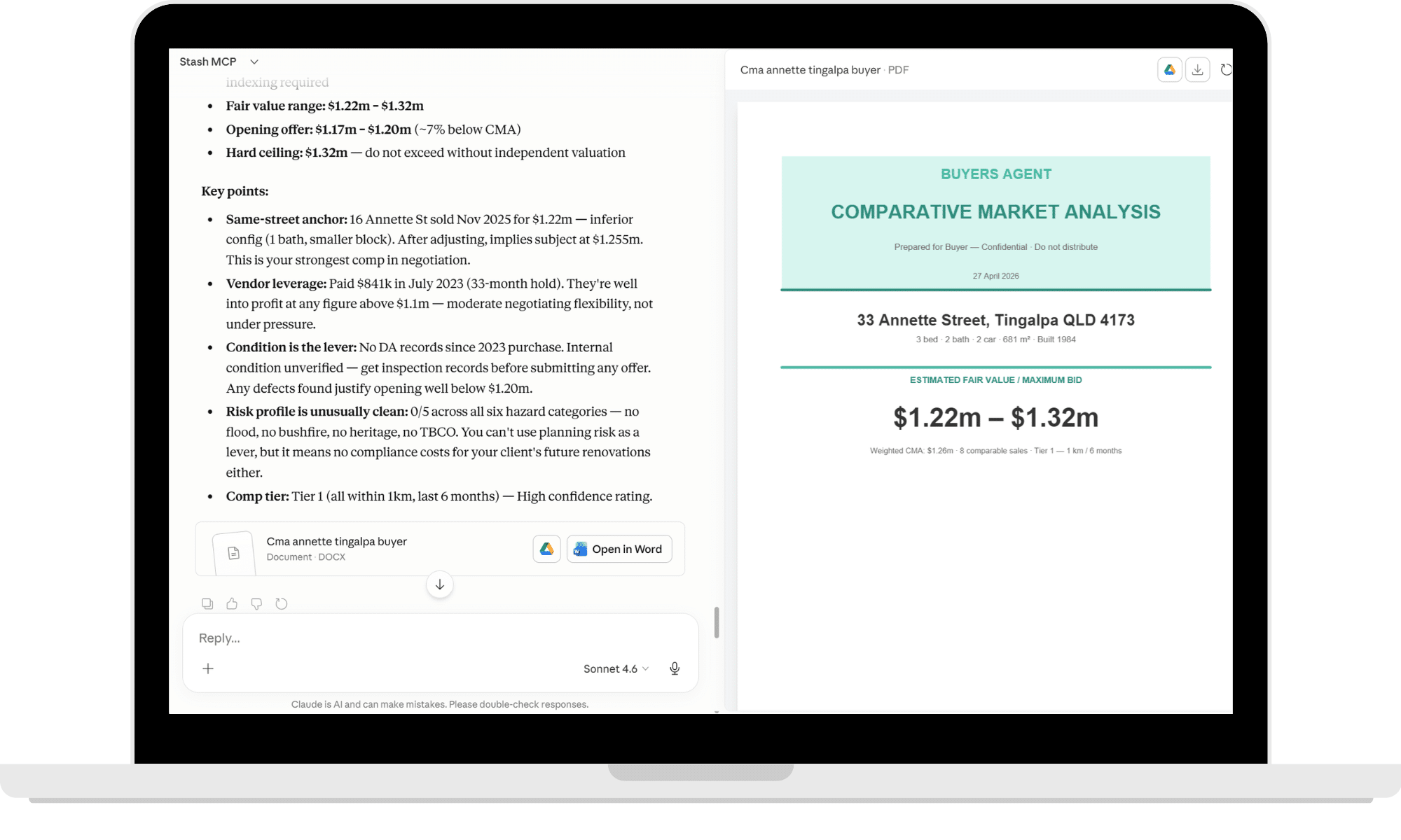 Stash MCP generates buyer-side CMA’s built for negotiation, not presentation. Real comps, adjusted properly, with a clear fair value range and a hard ceiling so you don’t overpay. You’re not guessing. You’re walking in with evidence.