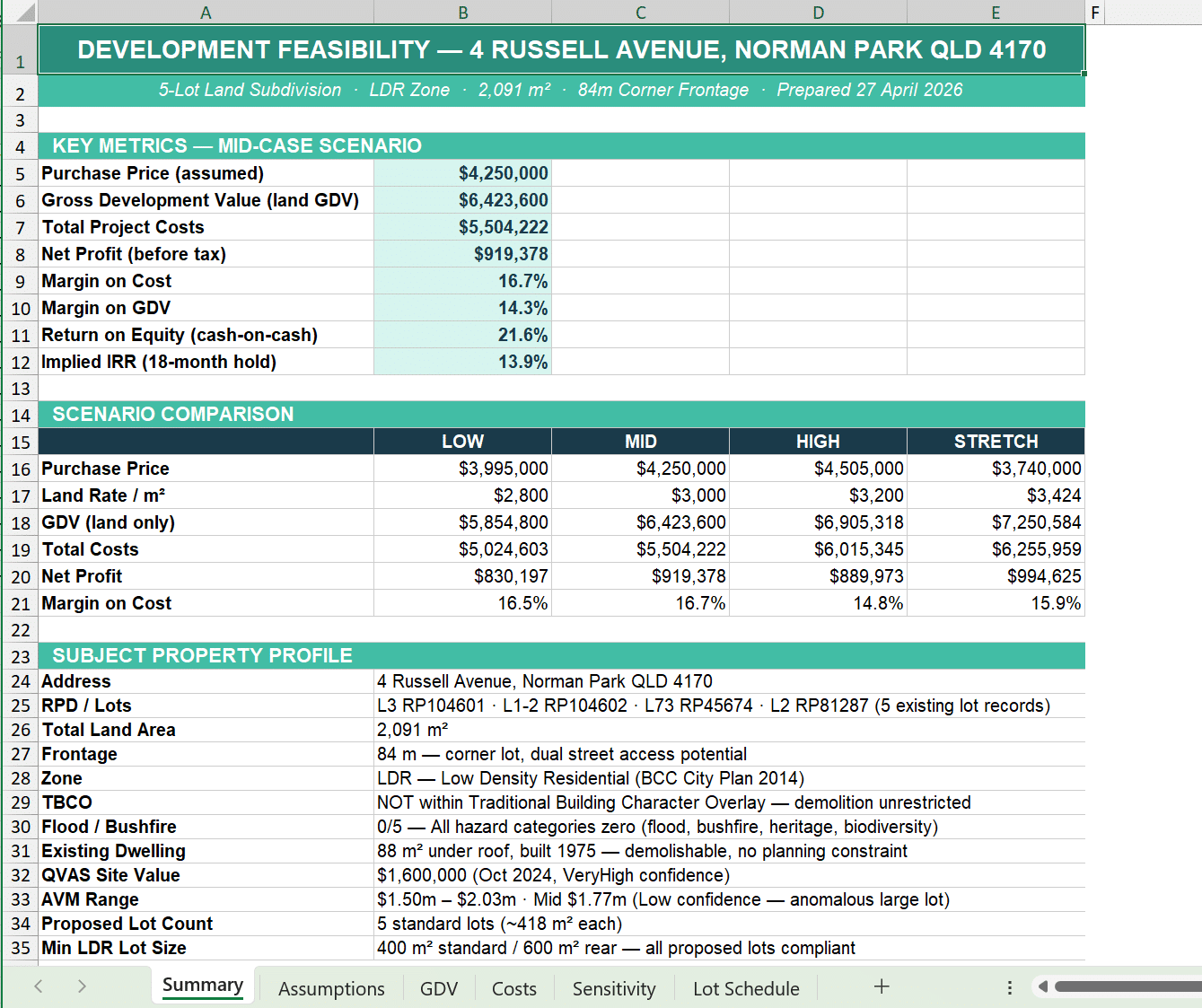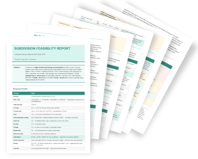 Lot configurations, pricing ranges, cost variations and margin sensitivity — all structured so you can make a call quickly. Whether you’re subdividing, holding or building, you can model it properly.